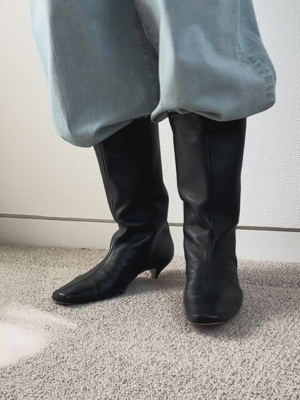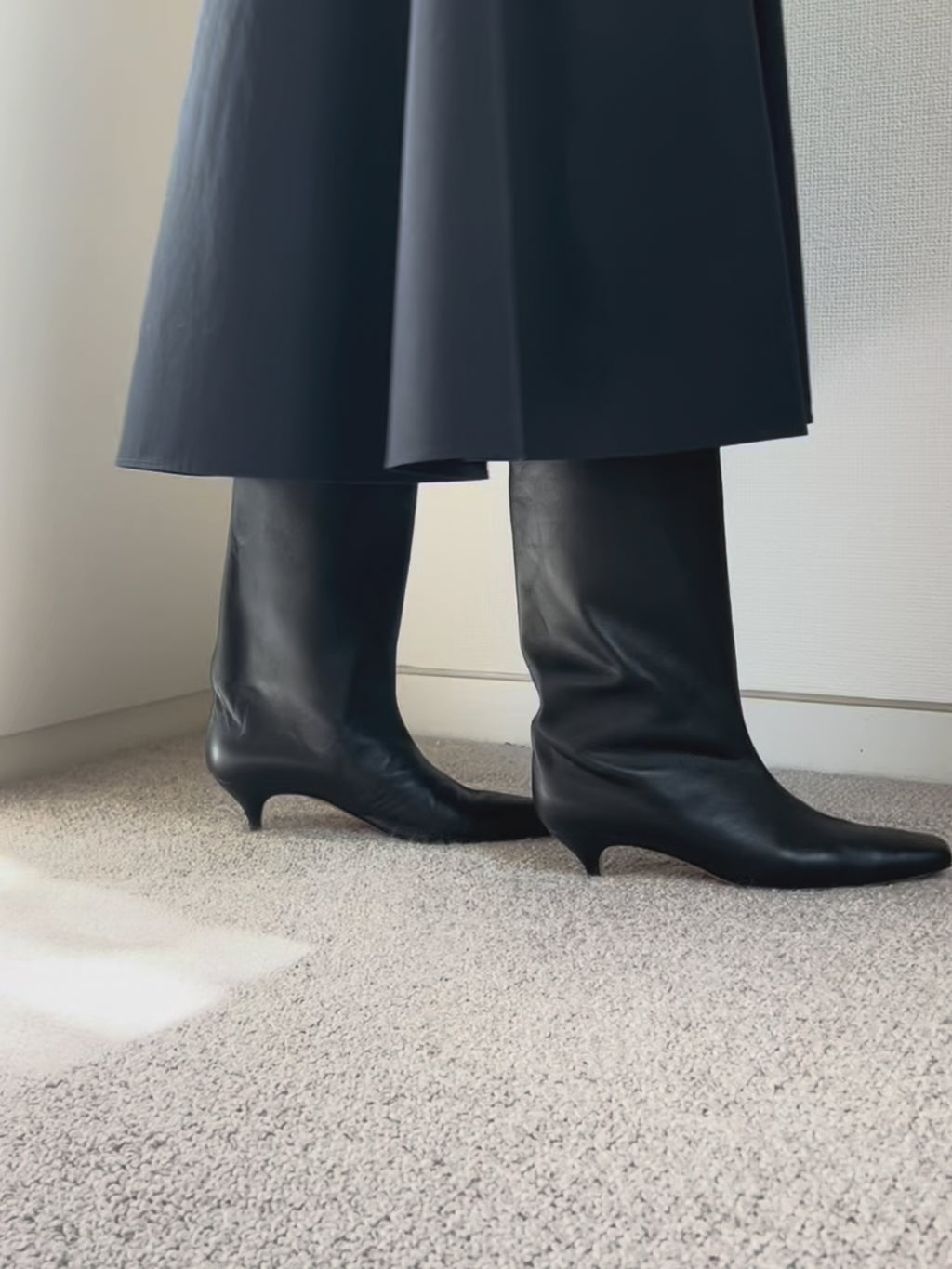 モダンなスクエアトゥと、華奢なキトゥンヒールのバランスが美しい一足。 ロング丈にはない新鮮なミドル丈が、足元に抜け感を与え、スタイリングをアップデートします。